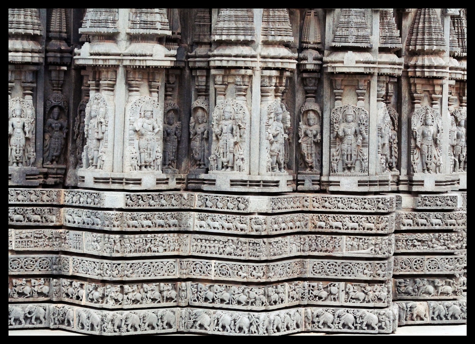The basement of the outer wall is highly ornamented with friezes of elephants, scrolls, epic and puranic scenes, small images with intervening turrets and columns with figured in between number of gods and goddess and their attendants adorn the walls. The lathe turned pillars and delicately carved 16 different types of ceilings are the characteristic feature of the Hoyasala art.